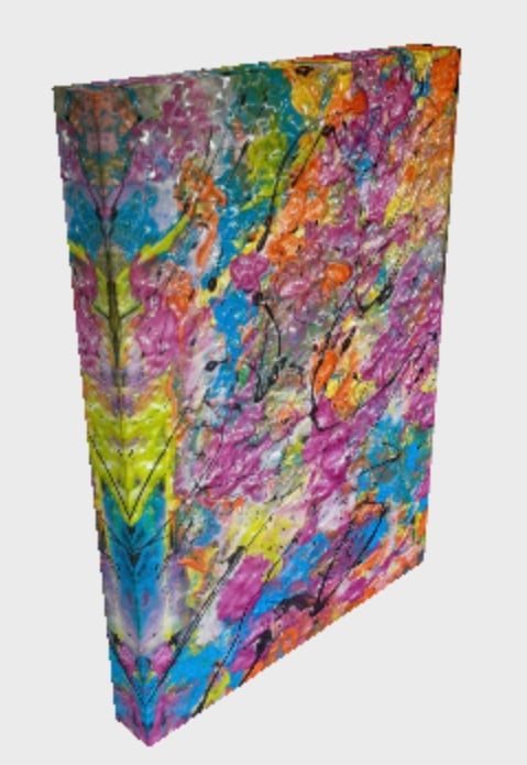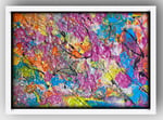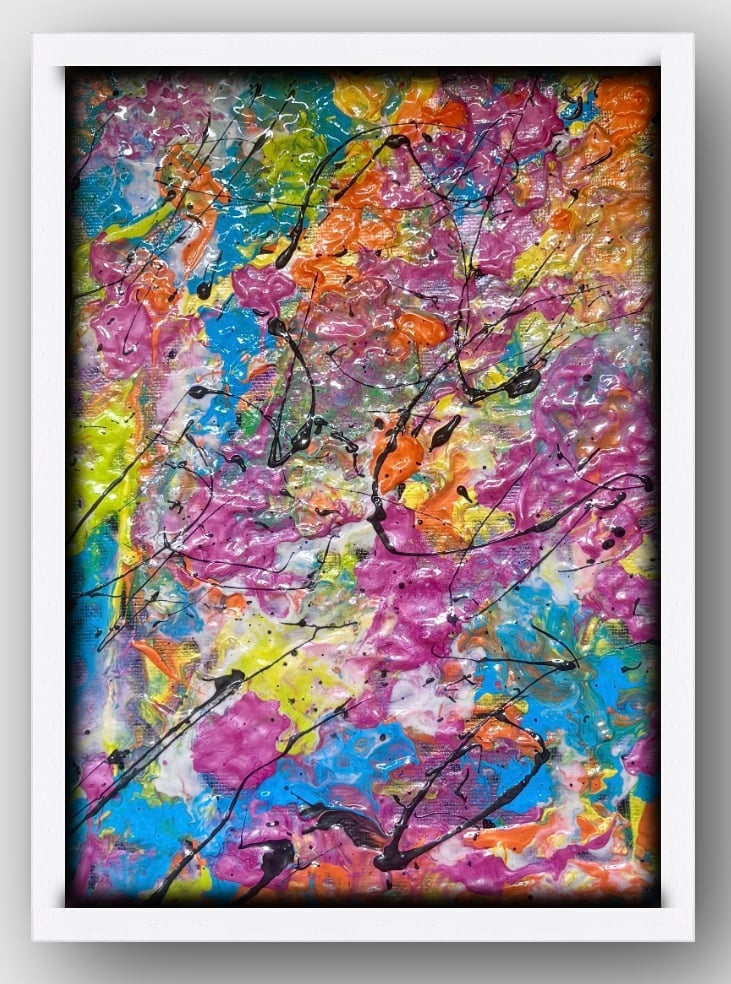 A celebration on canvas! Confetti Rain is a high-energy action painting bursting with vibrant splatters of magenta, electric blue, and sunny yellow. Layered with glossy textures and bold, rhythmic black arcs, this original captures a sense of joyful, uninhibited movement that will brighten any modern space.