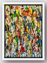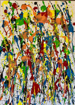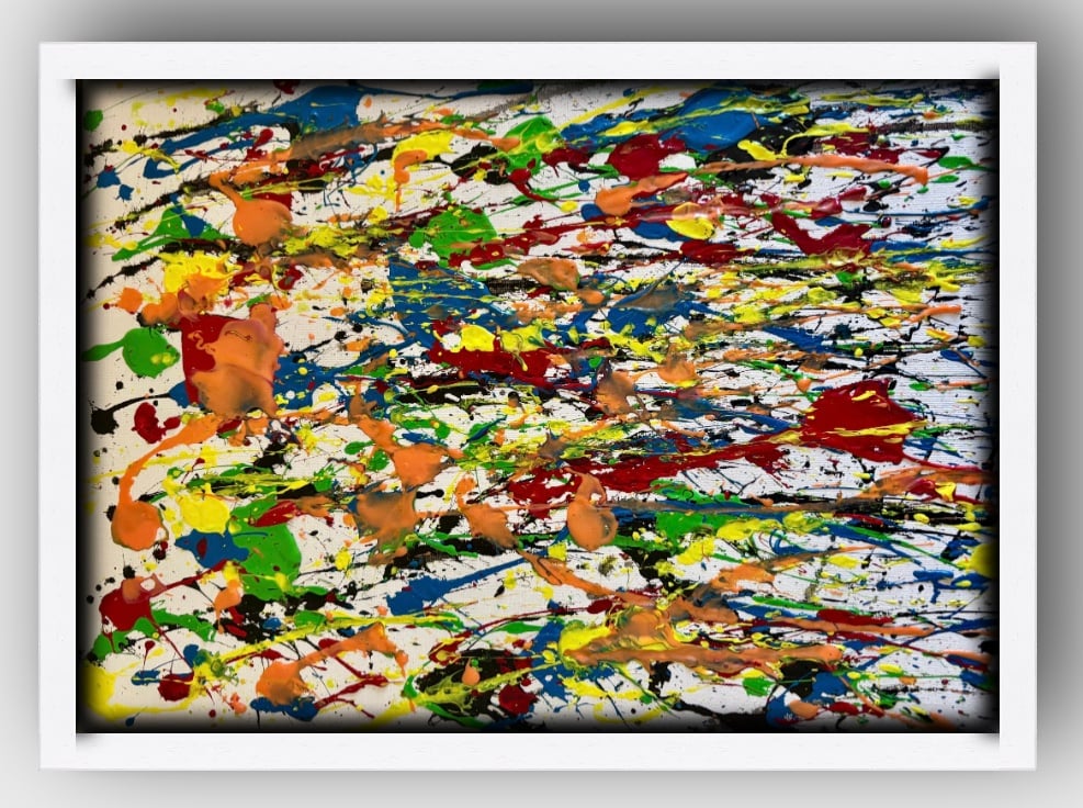 A joyous, multi-coloured celebration of pure creativity. This piece is a riot of primary and secondary colours, featuring energetic splatters and drips that move across the canvas in every direction. It is the ultimate "chill" statement for anyone who loves bold, uninhibited colour.