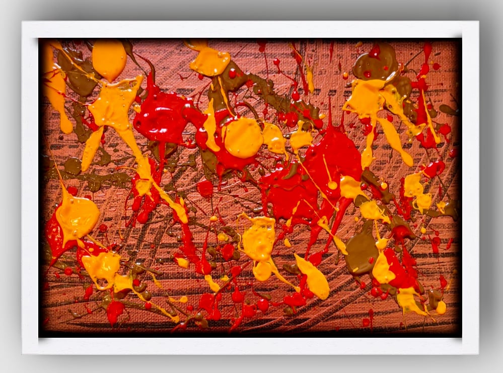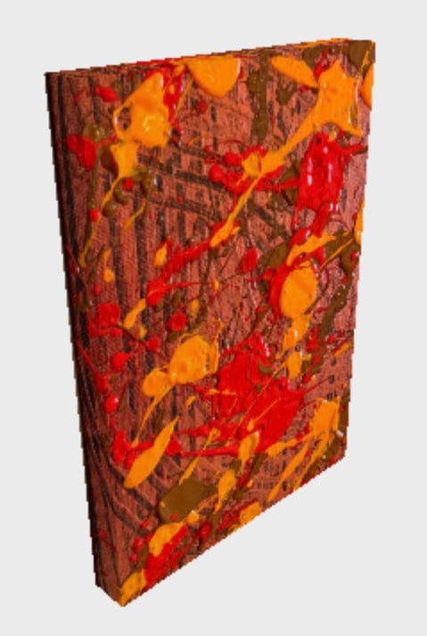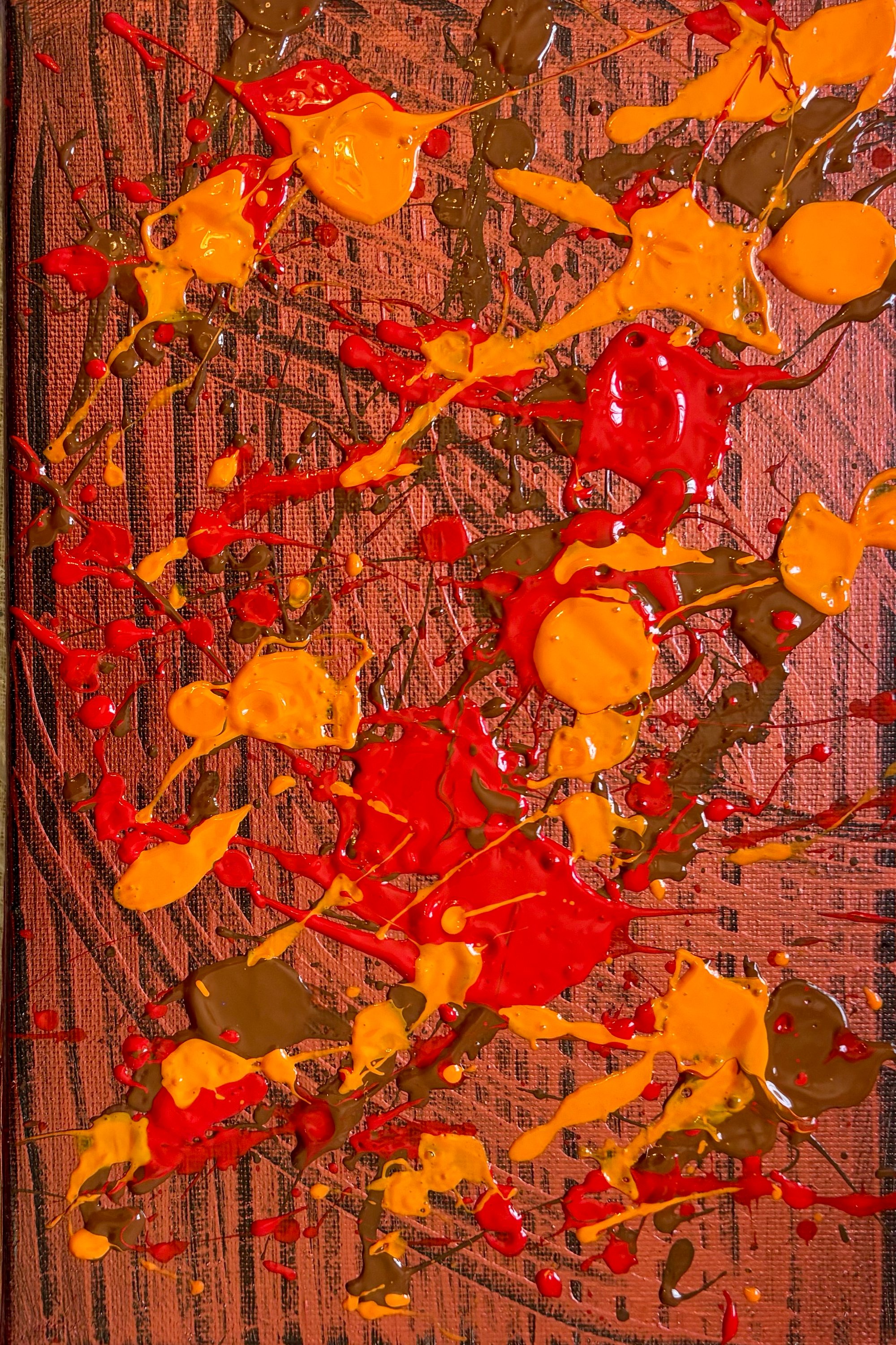 "Solar Flare" is a high-energy exploration of movement and heat. Vibrant splashes of molten orange and fiery red erupt across the canvas, balanced by earthy tones that add a grounded, natural depth. A powerful "chill" statement piece for any modern space.