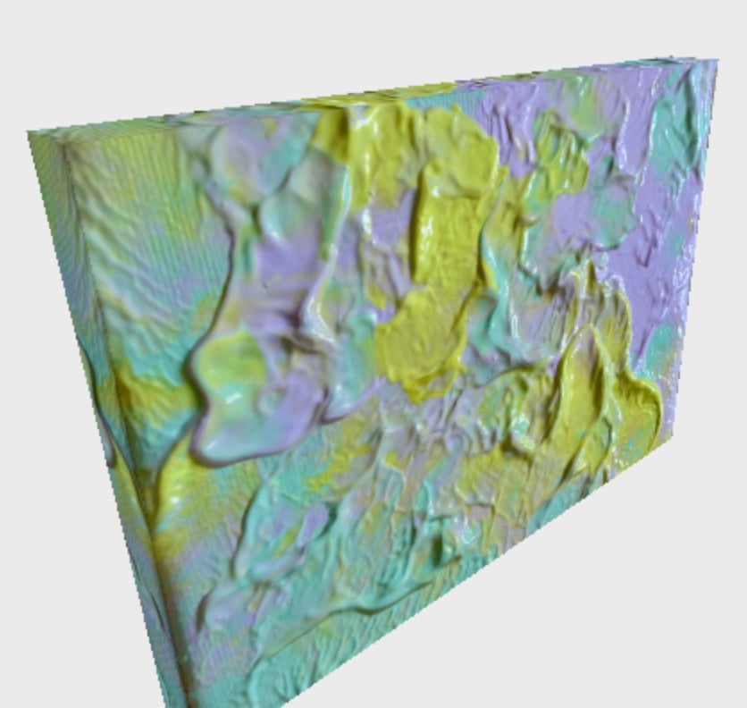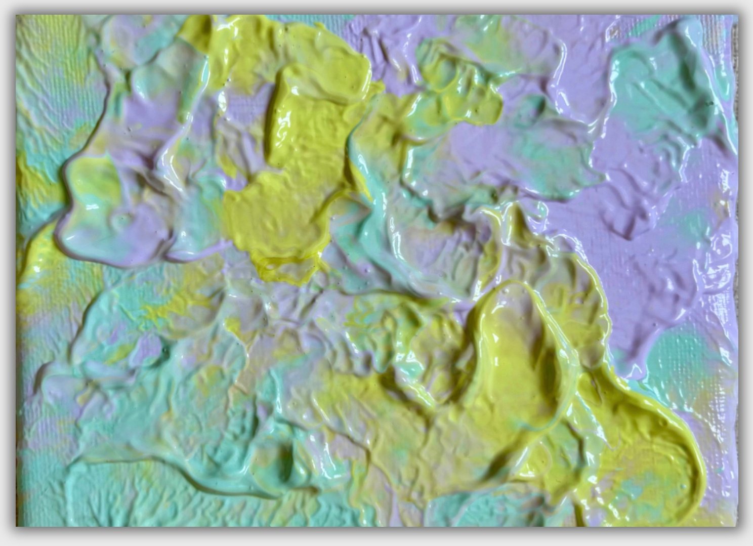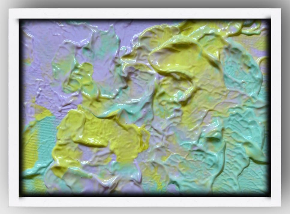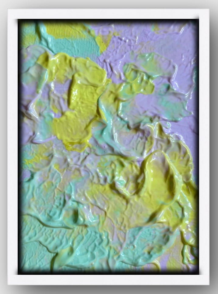 A light-as-air exploration of sculptural texture. Sweet Confection features pillowy, impasto swirls of lemon yellow, pale lavender, and mint green. Its thick, creamy ridges and delicate pastel palette create a tactile landscape that feels as soft and joyful as a spring dream.
